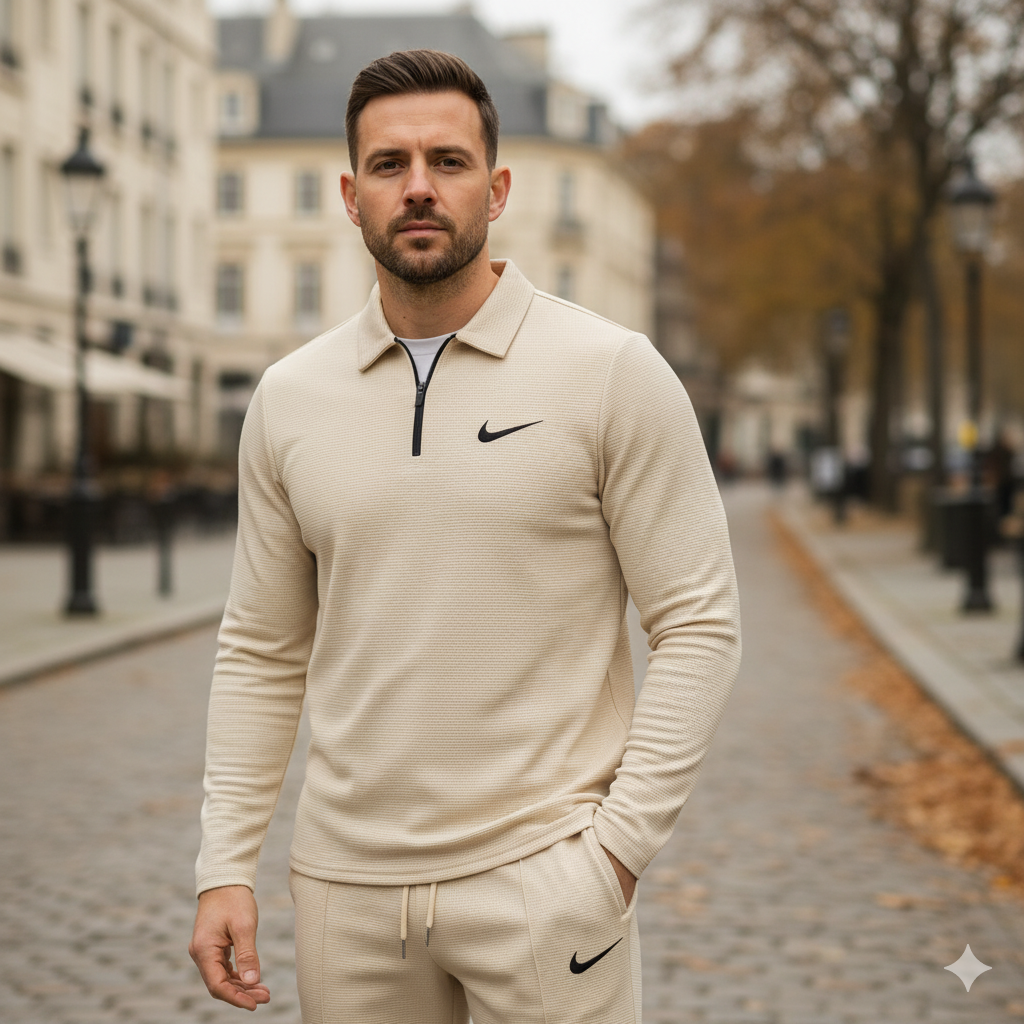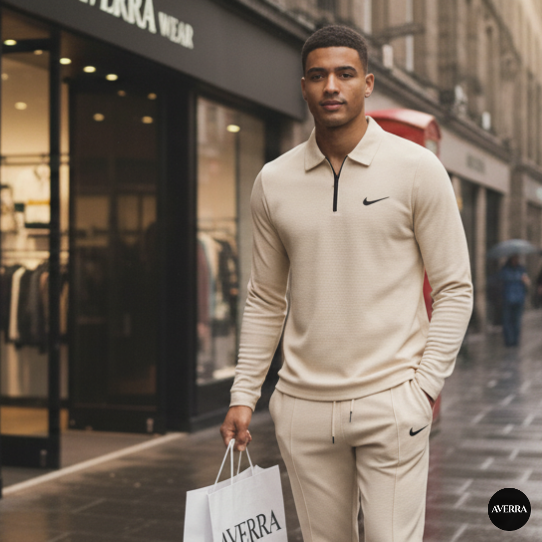 Elevate your everyday style with this men’s two-piece casual sportswear set, featuring a long sleeve zip polo shirt and matching trousers in a sleek beige tone. Designed for both comfort and versatility, this outfit blends smart-casual fashion with relaxed athleticwear.