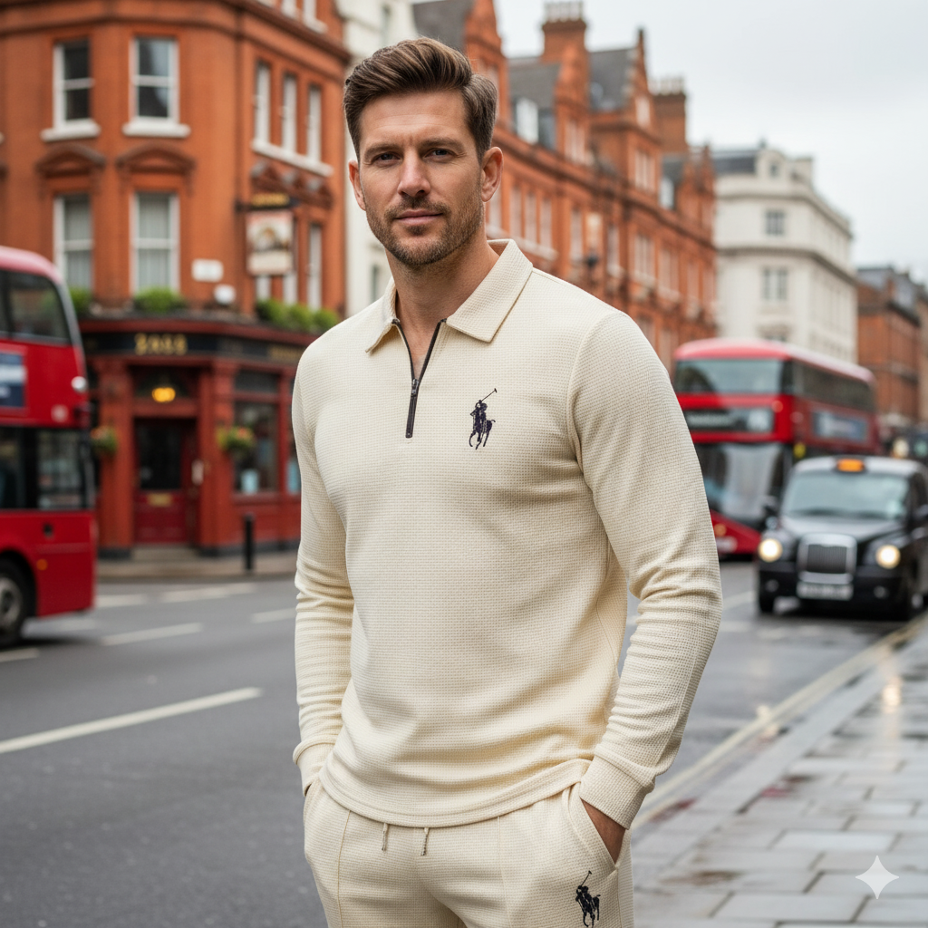Elevate your everyday style with this men’s two-piece casual sportswear set, featuring a long sleeve zip polo shirt and matching trousers in a sleek beige tone. Designed for both comfort and versatility, this outfit blends smart-casual fashion with relaxed athleticwear.
